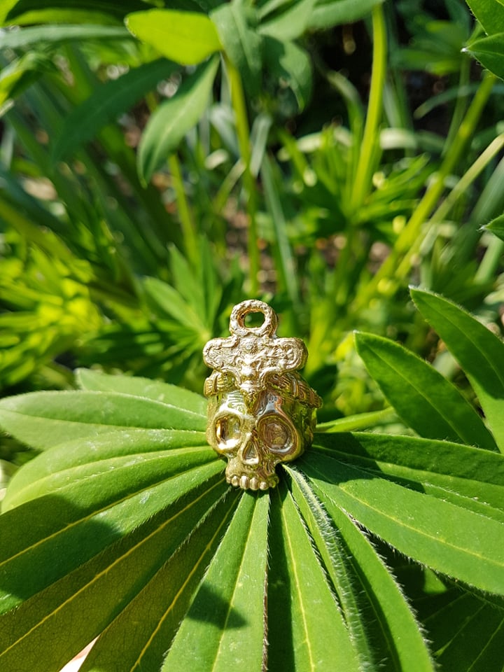 A skull ring inspired by reading Chariots of the Gods, which is based on the hypothesis that the technologies and beliefs of many ancient civilisations were given to them by ancient astronauts who were welcomed as gods.